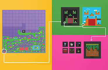 It all starts with an idea. We provide resources that encourage collaboration while guiding students through a design thinking process. Students create their own 13-bit layouts, characters, and art for their game.
